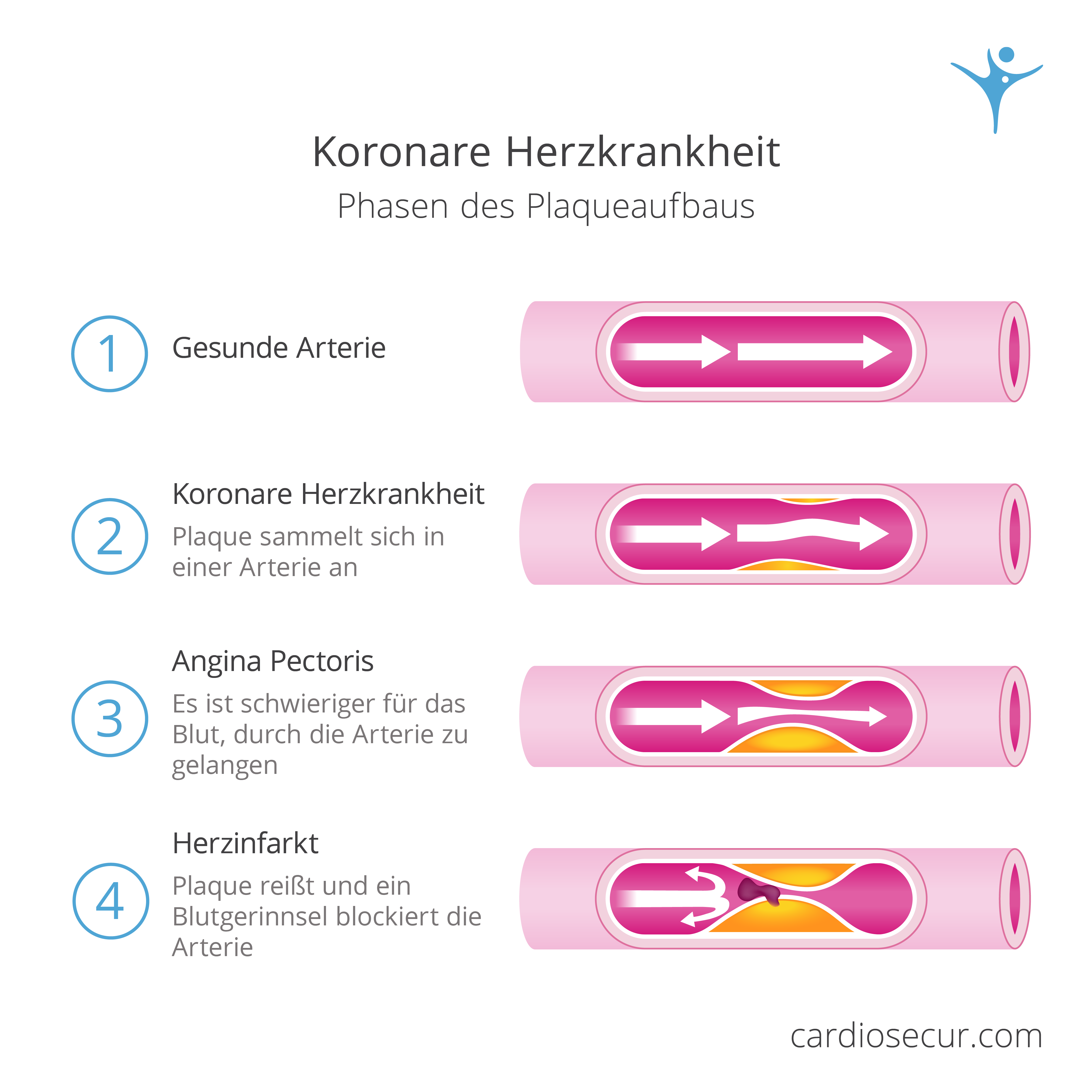 Das Gewebe der Herzkranzgefäße verliert durch die Arteriosklerose seine natürliche Elastizität und Widerstandsfähigkeit. Die entstandenen Plaques können sich entzünden und reißen. Um einen solchen Riss (Ruptur) zu schließen, sammeln sich Blutkörperchen, die das Gefäß aufgrund des verminderten Umfangs verstopfen und damit verschließen können. Der Blutstrom und die damit einhergehende Sauerstoffversorgung des betroffenen Herzmuskelgewebes unterbricht und das nicht mehr durchblutete Gewebe stirbt ab. Diesen Vorgang bezeichnet man als Herzinfarkt. Der Gefäßverschluss muss dann so schnell wie möglich invasiv beseitigt oder überbrückt werden.