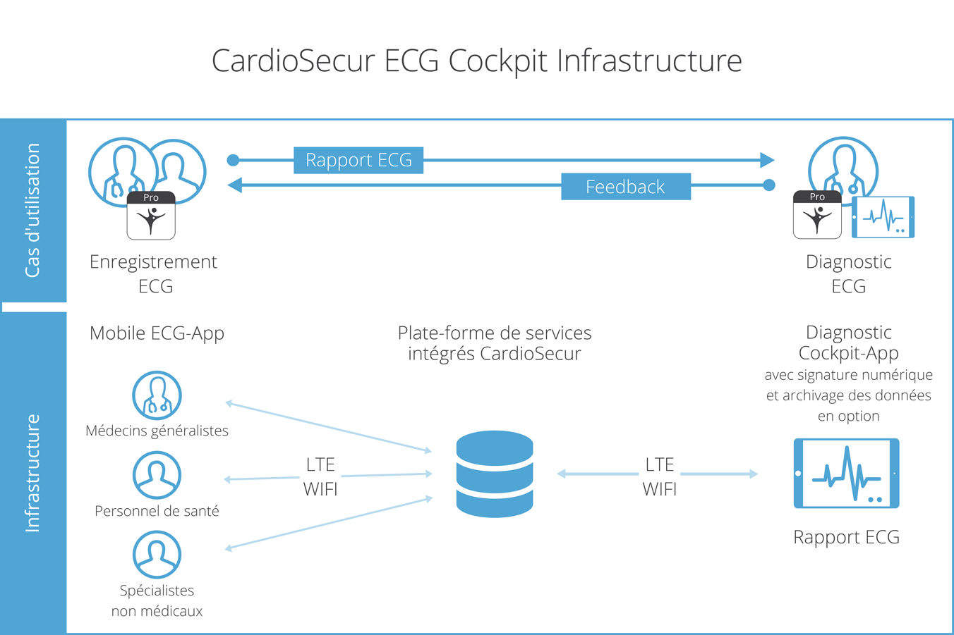 Nos appareils médicaux ECG mobiles de classe IIa CardioSecur Pro (fonctionnalité à 12 et 22 dérivations)s'intègrent parfaitement au ECG Cockpit conforme à la norme ISO27001 . Pour les sauvegardes de données ou le transfert de données brutes, S2S Integration constitue un complément parfait.