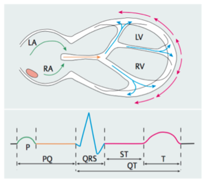 Figure 2: Pathway of an electrical impulse as it corresponds to the spikes & waves on an ECG (Source: Trappe, H-J/Schuster, H-P: EKG-Kurs für Isabel. Stuttgart, 6. Auflage (2013), S. 3 Abb 1.2)